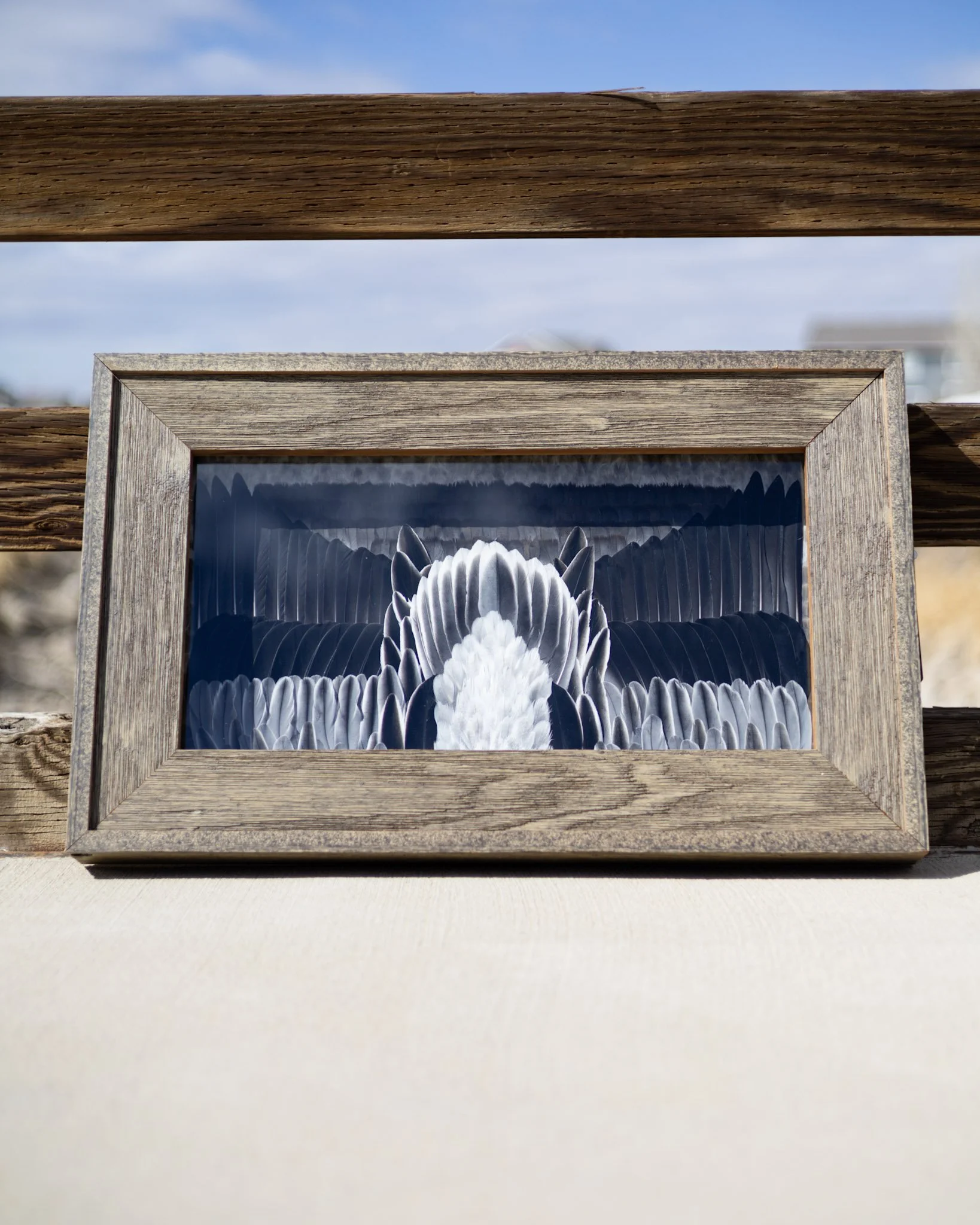 Your arranged feathers are professionally mounted in a custom frame or shadow box. We select framing options that complement the natural tones of the feathers and suit your display preferences.